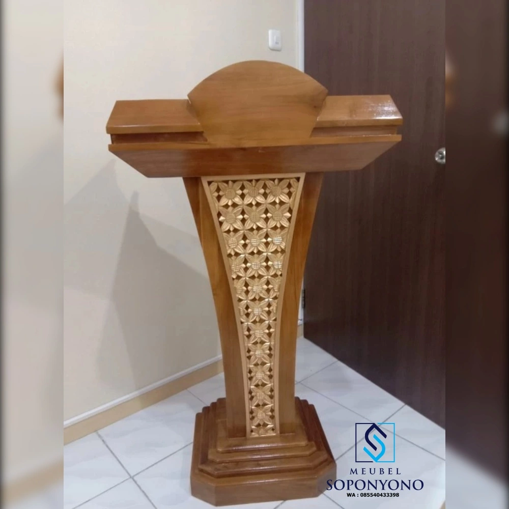 Mimbar Pidato Minimalis Kayu Jati Jepara merupakan produk furnitur berkualitas tinggi yang dirancang untuk memberikan kesan elegan dan berwibawa pada setiap ruang ibadah, aula, maupun ruang pertemuan resmi. Menggunakan bahan utama kayu jati pilihan dari Jepara daerah yang dikenal sebagai sentra pengrajin mebel terbaik di Indonesia, mimbar ini menawarkan perpaduan antara kekuatan, ketahanan, dan keindahan alami serat kayu yang menawan.
